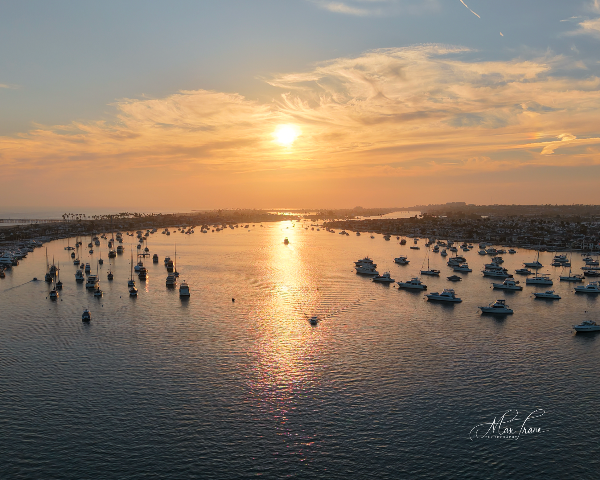 Experience the serene beauty of Newport Harbor at sunset with this stunning image. The sky transforms into a vibrant palette of warm hues reflecting gently on calm waters, capturing the peaceful sunset. Perfect for adding a touch of natural elegance and tranquility to any space.